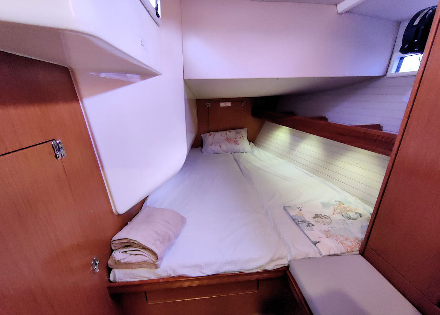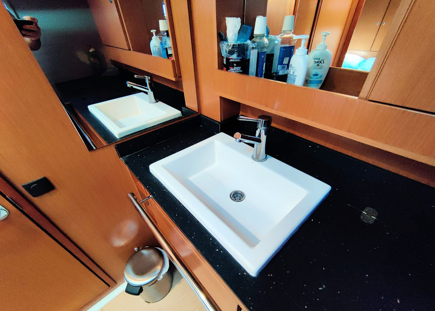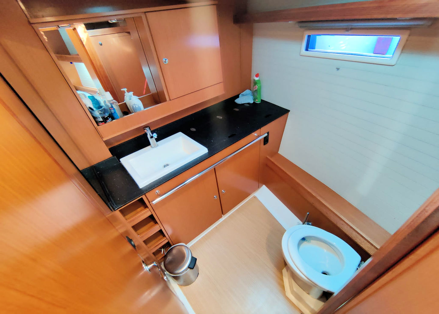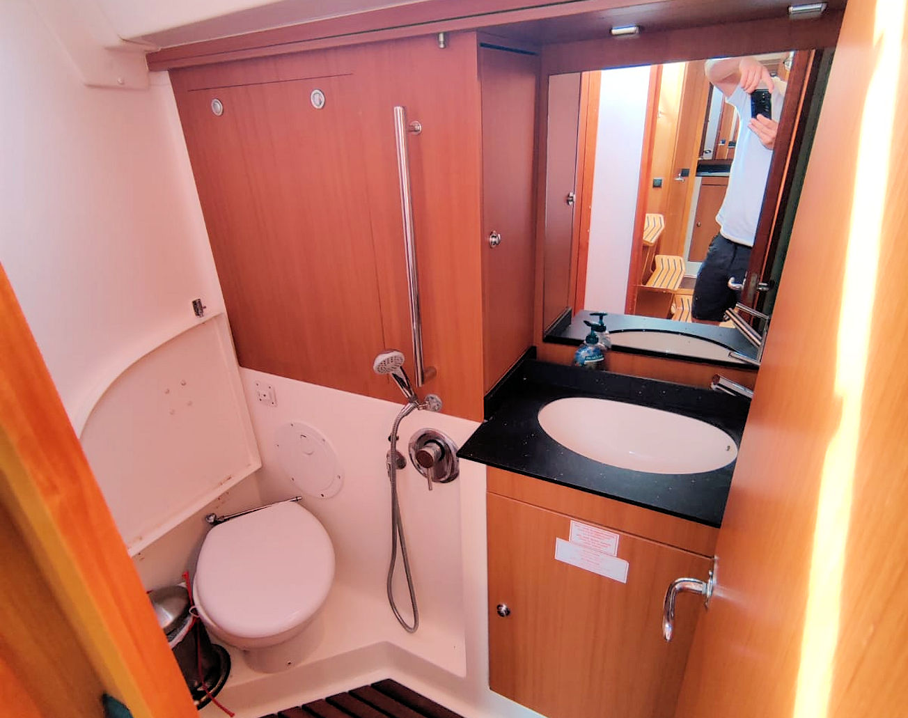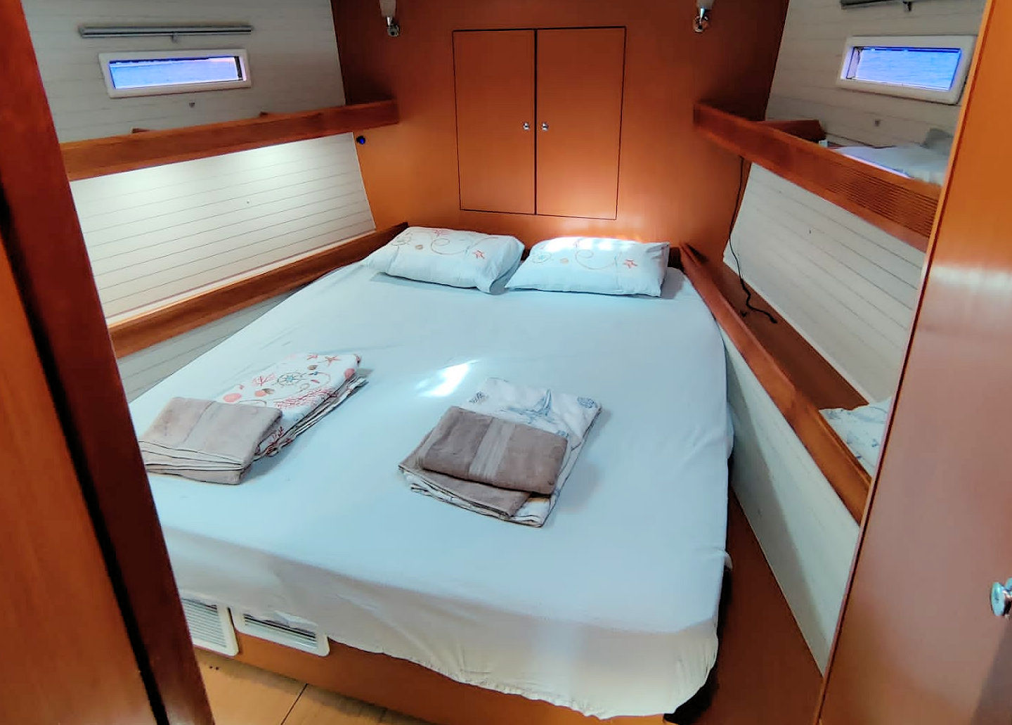 The interior design of the 3 cabins creates an ideal setting for families and friends, accommodating up to 8 people. The owner's cabin, with a cloakroom, indoor bathroom, and separate shower room, provides guests with privacy as if they were at home. The additional equipment, such as a dishwasher, generator, air conditioning, electric winches, and an electric roller, makes staying and traveling unexpectedly easy and enjoyable. Each cabin has its own separate head with a shower, toilet, and sink. Additional amenities include an 8kW generator, full air-conditioning, electric toilets, an electric furling system, electric winches, sunbeds, pressurized hot/cold water, a TV/DVD, a Hi-fi music system, a large tender with a 15HP outboard, and much more! It is the perfect platform for both training and charter, an ideal way to experience the joy of sailing, proving that you can indeed mix the best of both worlds: comfort and adventure!