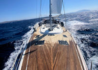 Although this is a high-profile showboat, there would be no point in paying for top-dollar designers if it wasn't built properly. This prototype Bavaria Cruiser 55 showcases a fastidious level of quality control. Farr's expertise is reliable, and BMW Designworks USA impressed us by bringing fresh, yet practical ideas to the deck and interior design. Some might question the height of the freeboard. I understand that Bavaria wanted to fit a garage below the cockpit and provide good headroom in the master cabin, but you do feel dwarfed in the saloon, and anything other than stern-to boarding will be a challenge. These topsides encompass a gargantuan interior while maintaining a sleek coach roof. Combined with low coamings and a large walk-through cockpit, it's easy to deduce that her target clientele sails in the calm sunny waters of the Mediterranean. She's manageable, fast, and fun.