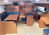 The saloon is warm, cozy, and smartly spacious, with enough room to seat eight once the double bench (with a magnetic backrest) slides out from under the island. The galley features a refreshing design that utilizes a workstation island, surrounded by grab bars that satisfy the seaworthy credentials. It somewhat resembles a kitchen in a modern flat, complete with a front-opening, full-size fridge-freezer (there's also a lift-top fridge) and a large deep sink with a draining sink. Stowage is abundant.