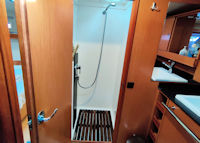 The heads are bright and airy (again with ample headroom), boasting a proper shower permanently mounted on a stand. A seat/cover drops over the small heads, and a Perspex door keeps the wash area dry. The heads have a smart, deep, lipped basin and a large mirror. Identical double aft cabins offer excellent headroom, changing space, and storage in tall double hanging lockers. Fiddled shelves run the length of the generous doubles, and four portlights help keep these cabins well-ventilated. Aft hatches provide access to the steering gear.