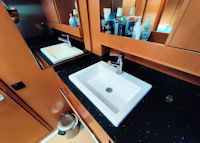 virtue-9Clean decks were strategic to BMW's aesthetics, so everything is hidden and led aft to maintain the look, and there's a plethora of clever ideas to help achieve this. The Bavaria 55 Cruiser arguably has the largest interior volume to LWL ratio. The forward ensuite is first class and a real selling point, with a separate stand-up shower room. It resembles more of a hotel bathroom, with ample space, a large contemporary sink and mirror, attractive downlights, and ample storage, including a lift-top laundry basket if you choose not to opt for a washing machine. A walk-in, full-headroom dressing room is located in the hallway of the opulent master cabin, providing enough hanging and storage space to accommodate even a diva's wardrobe. This allows for a completely uncluttered queen-size double bed. There's still 6ft 2in headroom and plenty of light from two large overhead hatches and two hull windows. A few pictures may be needed to detract from the vast amount of pale woodwork, which can sometimes feel more like a static caravan than an inviting cabin.