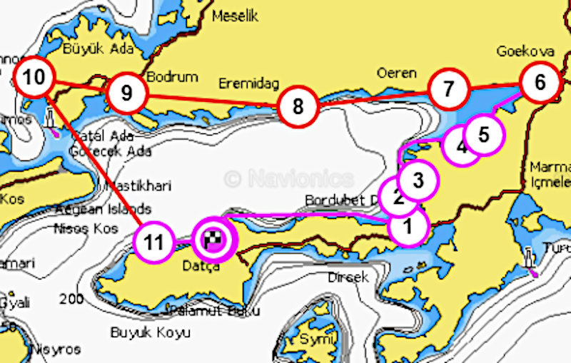 Departure is early again for this leg. After a swimming break We go downwind for our marina. You can leave tonite or spend a night at Datca restorants. Saturday morning boats will be cleaned, So you need to leave before 9:00
