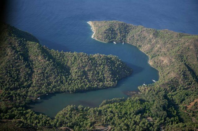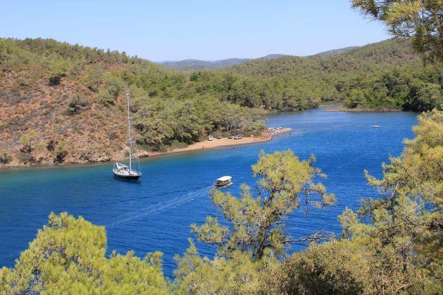 Today we will hop around more bays. First stop is Tuzla bay, a perfect swimming spot, then Longoz (Kargibuk).  Longoz is a sheltered cove, situated between forests. There are usually only a few boats here. Löngöz is back to back with Ballısu bay. Ballisu is a very deep bay with a narrow entrance, once inside, the bay twists into the land. A creek flows into the bay. There used to be a thick pine forest around the bay but ten years ago a fire decimated most of the region...it is slowly growing back now. Final destination is Okluk, commonly known as the pearl of Gokova. The lasrgest cove is actually called Degirmendere. When entering this cove, you will see another inlet called British Harbor. During World War I, British warships used to hide here, bombarding the Germans at night and retreating into this cove at daylight. There is a Presidential Residence located at the south part of the bay. On the north side, you can observe the statue of a mermaid in the water, erected by Sadun Boro. The air is heavy with the scent of pine and trees line all of the shore, a perfect setting for a relaxing evening.